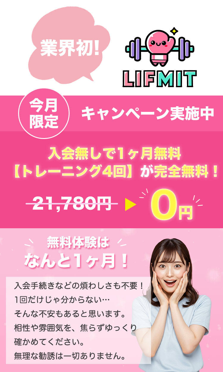 無料体験だけで終わる方もたくさんいらっしゃいます。無理な勧誘はありませんので、まずはお気軽にLIFMITのトレーニングを体感してみてください!